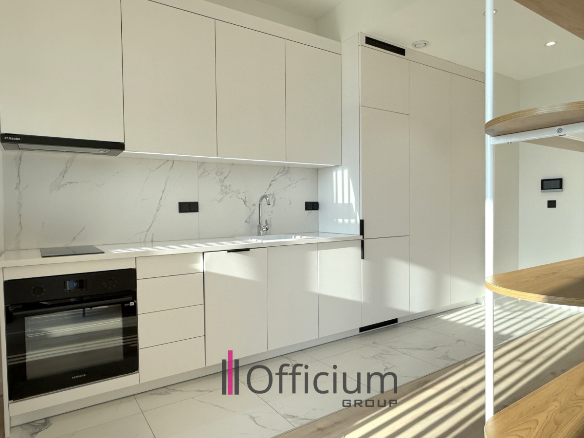 This modern 36 m² apartment, designed by an architect, features a spacious living room with a fully equipped kitchen (including furniture and household appliances), a sliping space, a bathroom with a bathtub, and a hallway with built-in wardrobes.