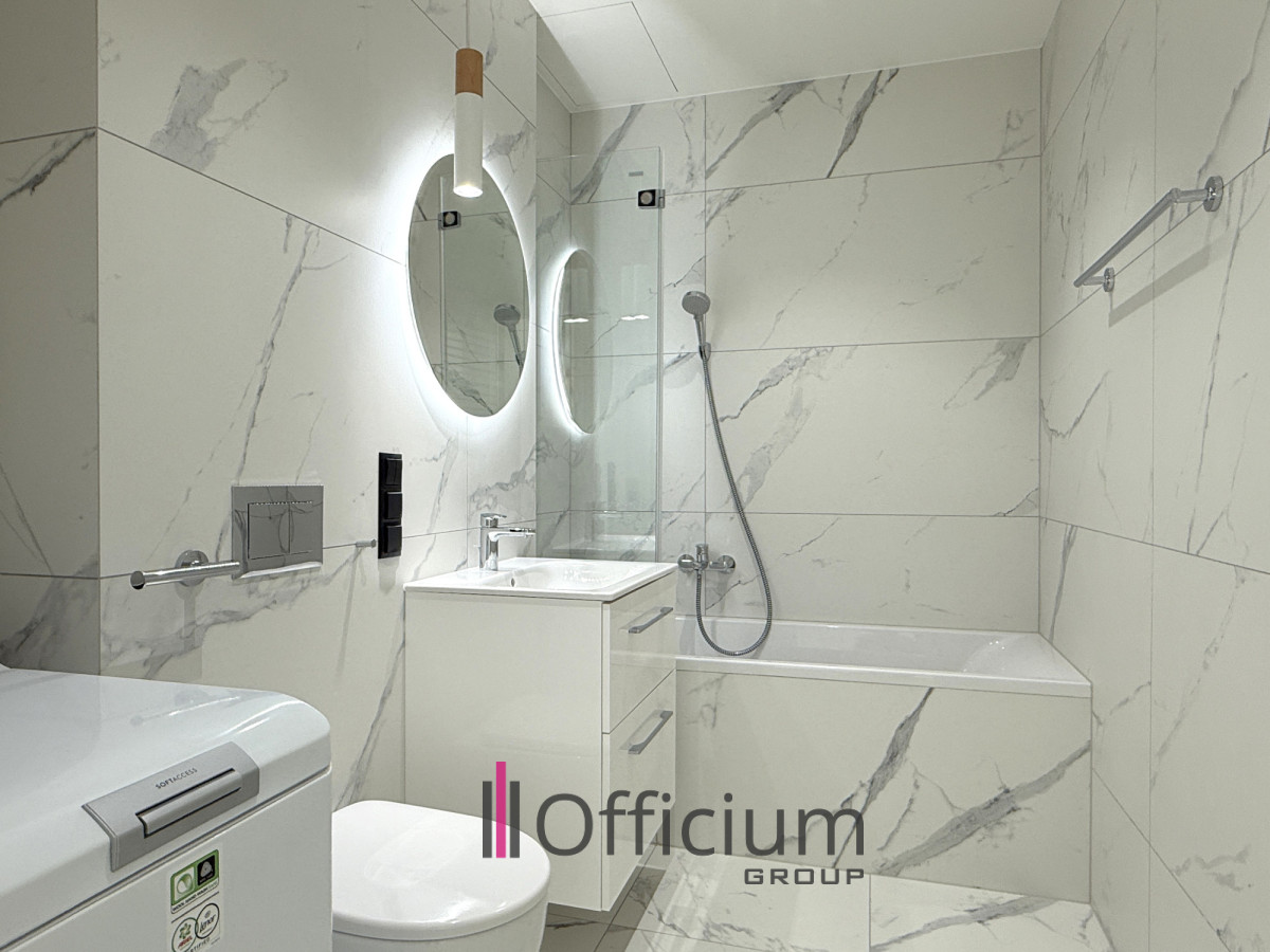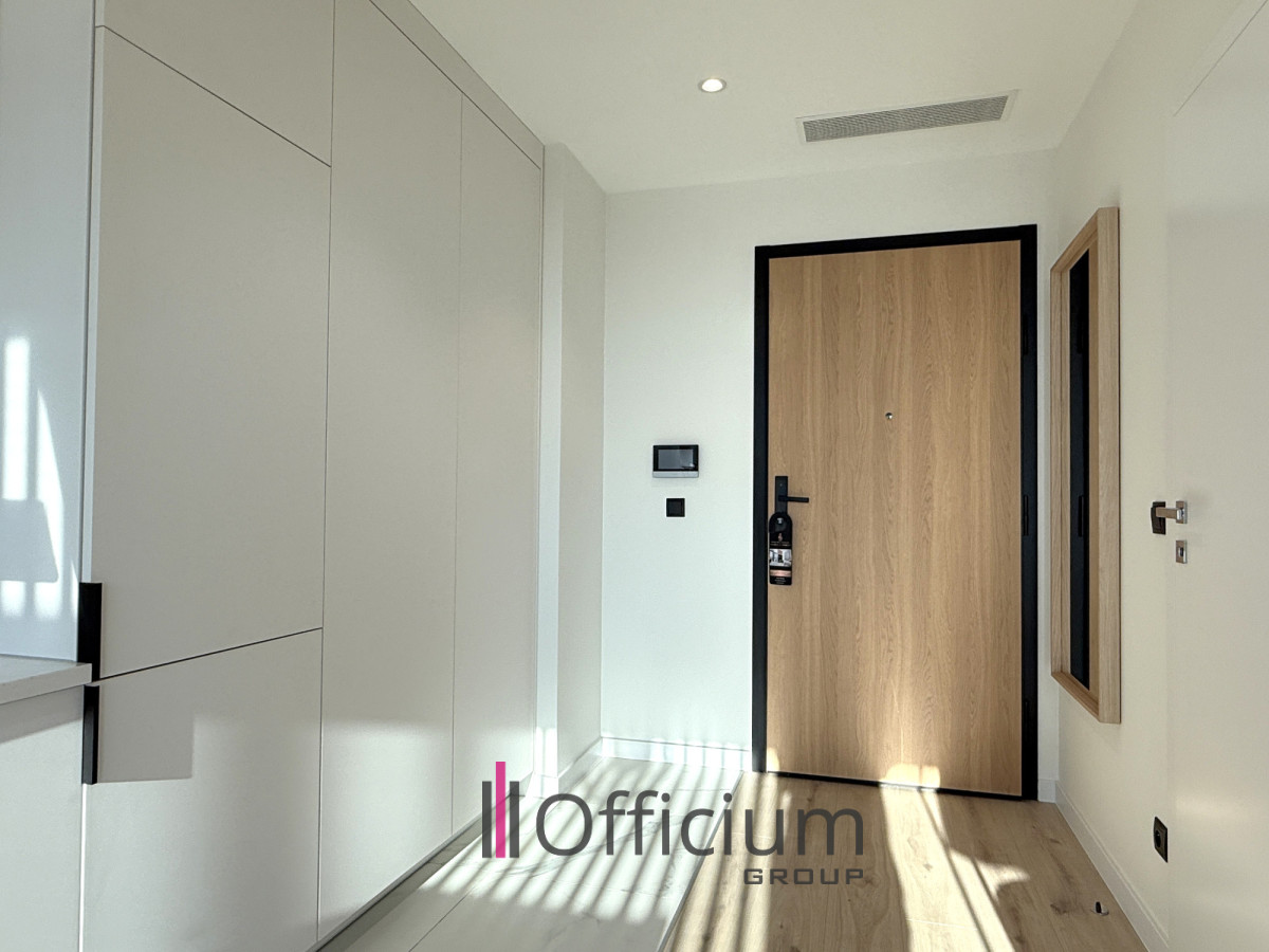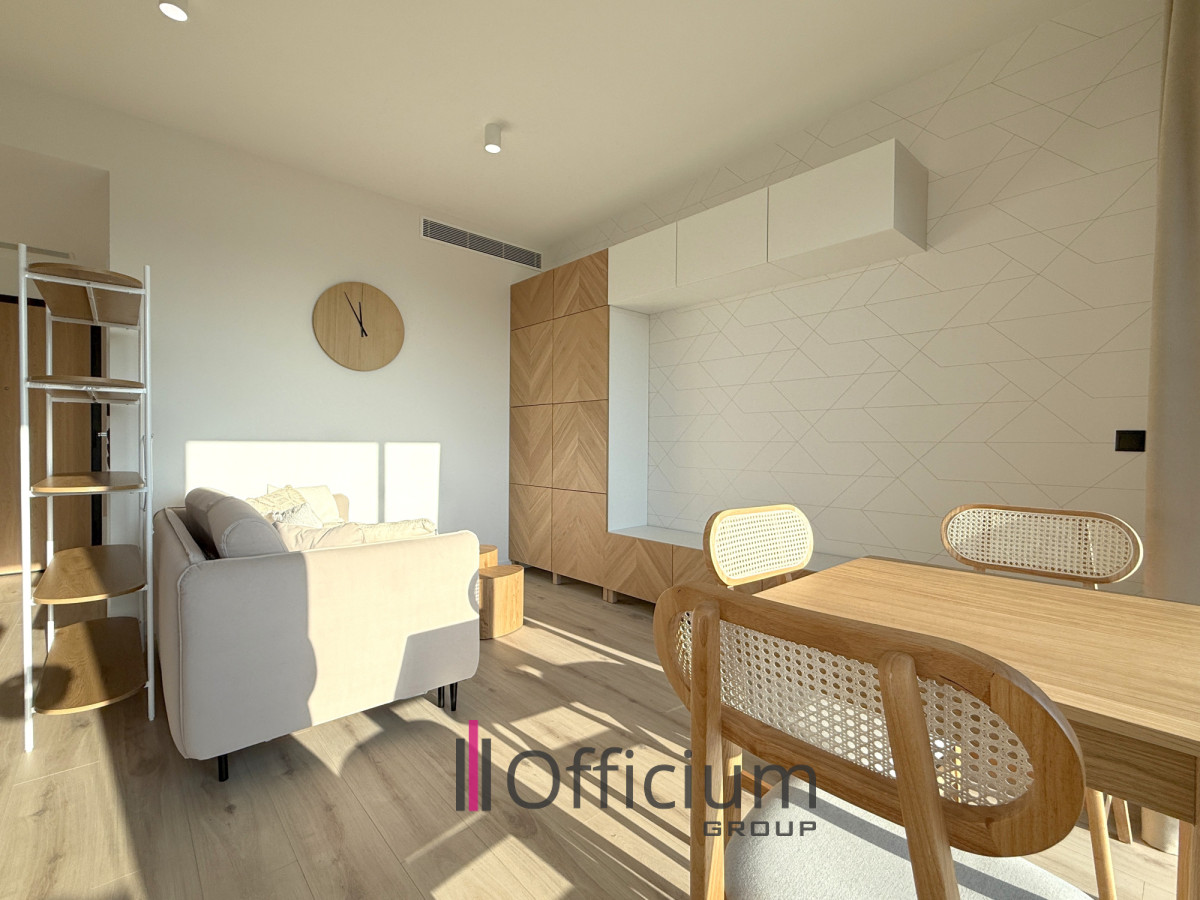 Nowoczesny apartament o powierzchni 36 m², zaprojektowany przez architekta, składa się z przestronnego salonu z aneksem kuchennym (w pełni wyposażonym w meble i sprzęt AGD), wydzielonej części sypialni, łazienki z wanną oraz korytarza z zabudowaną szafą.