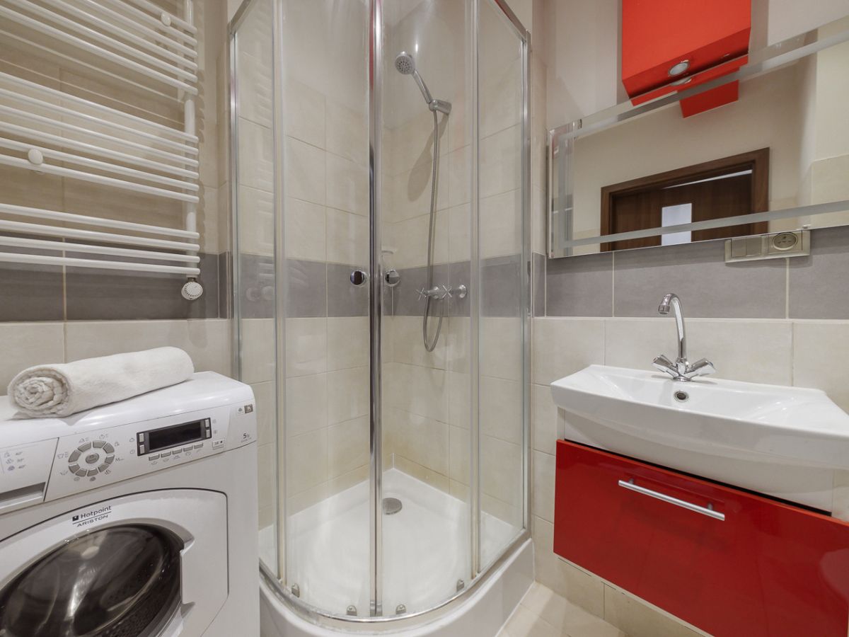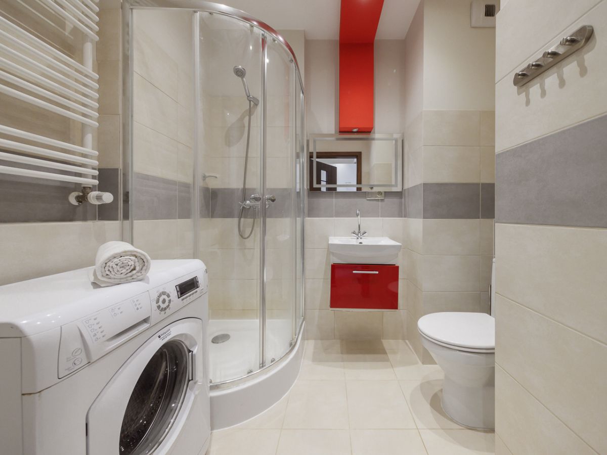 W skład mieszkania wchodzi salon z aneksem kuchennym oraz łazienka z prysznicem i pralką